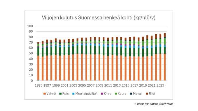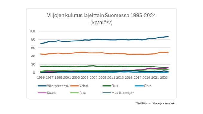 Kuva: Viljojen kulutus lajeittain Suomessa 1995-2024